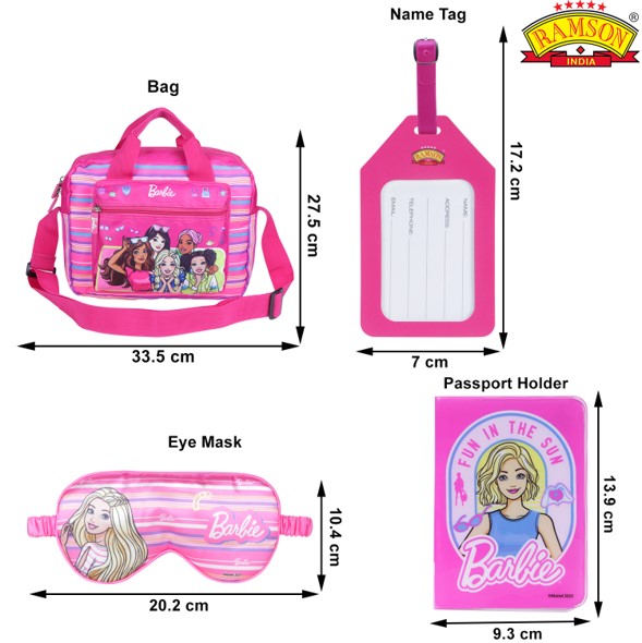 This delightful Barbie Pink Travel Kit is the perfect companion for young travellers embarking on their adventures. This comprehensive 5-piece set includes everything needed for a stylish and organised journey. The vibrant pink bag features a cheerful Barbie design with colourful stripes and showcases Barbie and her friends in fashionable outfits. Measuring 33.5 cm x 27.5 cm, the bag offers ample space for travel essentials whilst the adjustable shoulder strap ensures comfortable carrying. The set includes a practical name tag (7 cm x 17.2 cm) for easy identification, a charming passport holder (9.3 cm x 13.9 cm) featuring Barbie’s ‘Fun in the Sun’ design to keep important documents safe, and a comfortable eye mask (20.2 cm x 10.4 cm) adorned with Barbie graphics for restful sleep during travel. The bag features multiple compartments with zippered pockets for organised storage, sturdy handles for easy carrying, and durable construction. This Tramson travel kit makes an excellent gift for Barbie fans and transforms every trip into a fun-filled adventure, whether heading to a sleepover, holiday, or weekend getaway.